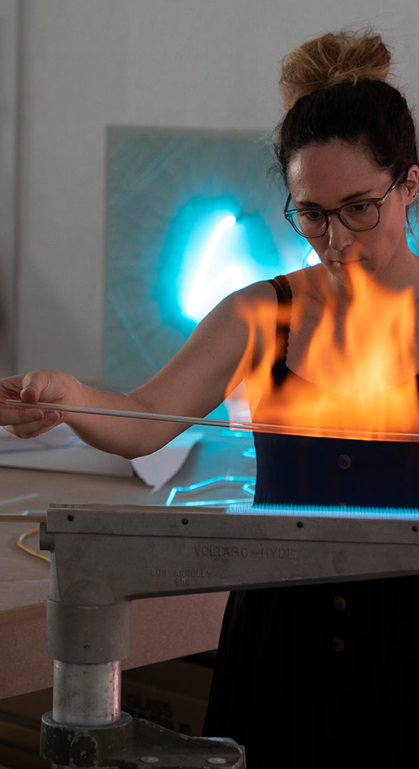 NEON lights are hand made from glass tubing. The words or shapes are bent by our experience tube bender using fire. Once the shape desired is finished the tube is starting a full cleaning process using high voltage and then the same tube is filled with noble gas. Different type of gas are used depending of the colour you will pick, Neon is by definition red when it’s on, and argon for example is a light blue. Portions of the sign are painted black to stop those parts of the tube from glowing. This creates separations between letters or design elements.